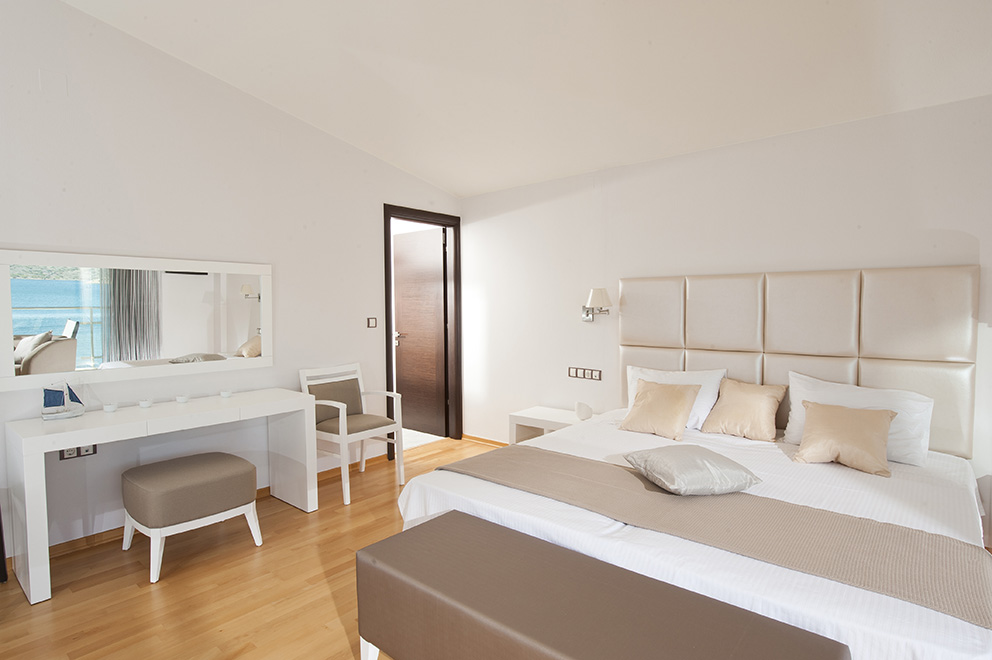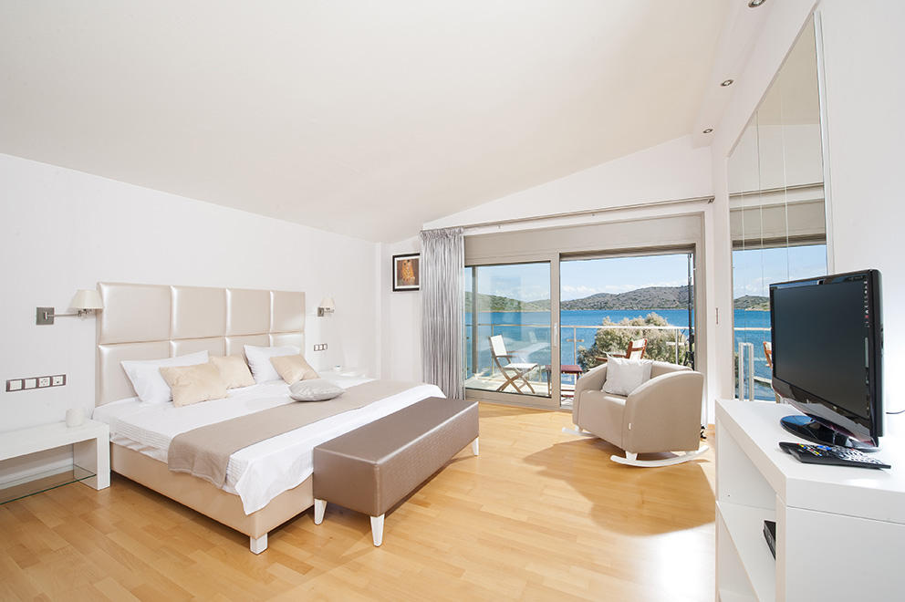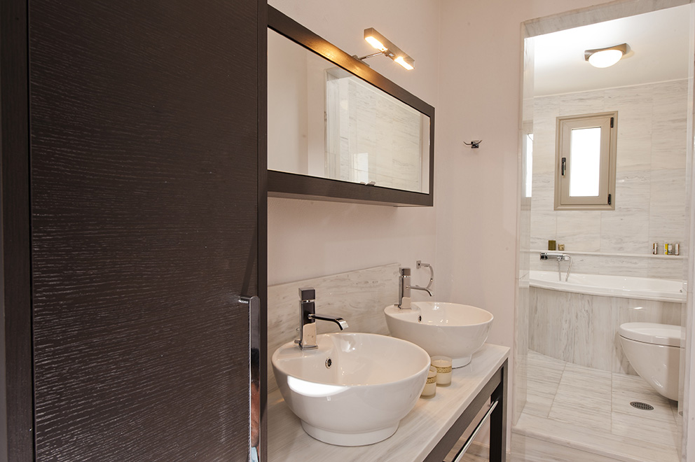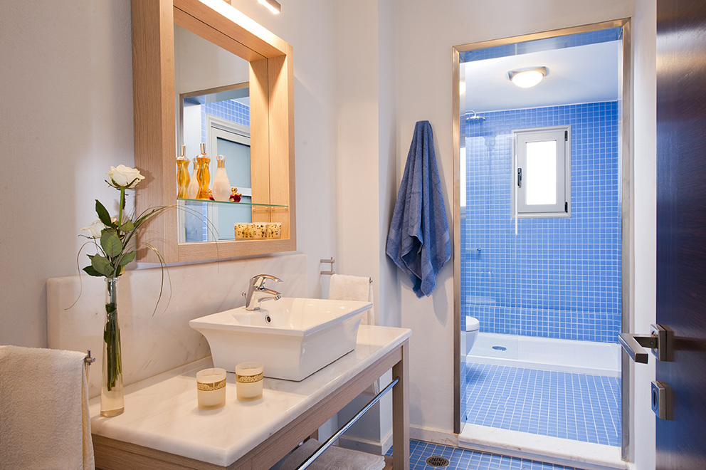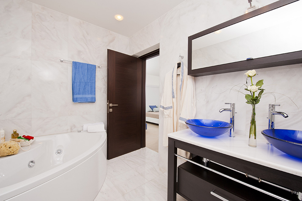All the bedrooms have been placed on the top floor of 94.50 m² The two smaller rooms are perfect for a friendly couple or kids, since one of them has a double bed and the other two single beds. These two bedrooms share one beautiful bathroom decorated in blue fashion. But the main attraction of the top floor is the master bedroom. Rest on your king size bed, while enjoying the soothing sound of the waves right outside your balcony door, or simply enjoy a jacuzzi in you en suite bathroom, decorated exclusively with top quality marble. All bedrooms have access to separate verandas, and amazing view of the beach and sea.